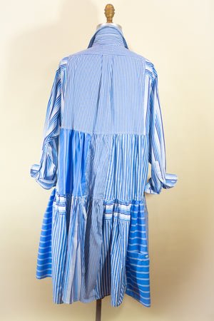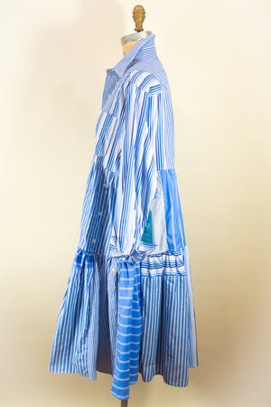 Now, two years later, the Montclair Reconstructed Shirt Dress has officially arrived! Each one-of-a-kind piece is handcrafted, cleverly using the original plackets, cuffs, and buttons as design elements to cut waste and crank up the style. And Johanna organically combines the patterns and stripes in each bespoke garment to command attention with perfect balance.