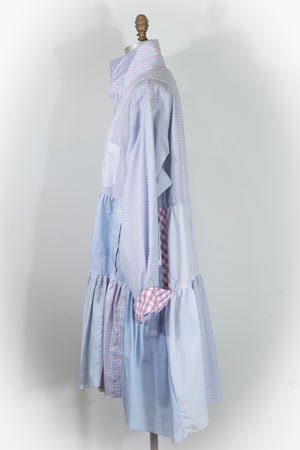 Now, two years later, the Montclair Reconstructed Shirt Dress has officially arrived! Each one-of-a-kind piece is handcrafted, cleverly using the original plackets, cuffs, and buttons as design elements to cut waste and crank up the style. And Johanna organically combines the patterns and stripes in each bespoke garment to command attention with perfect balance.